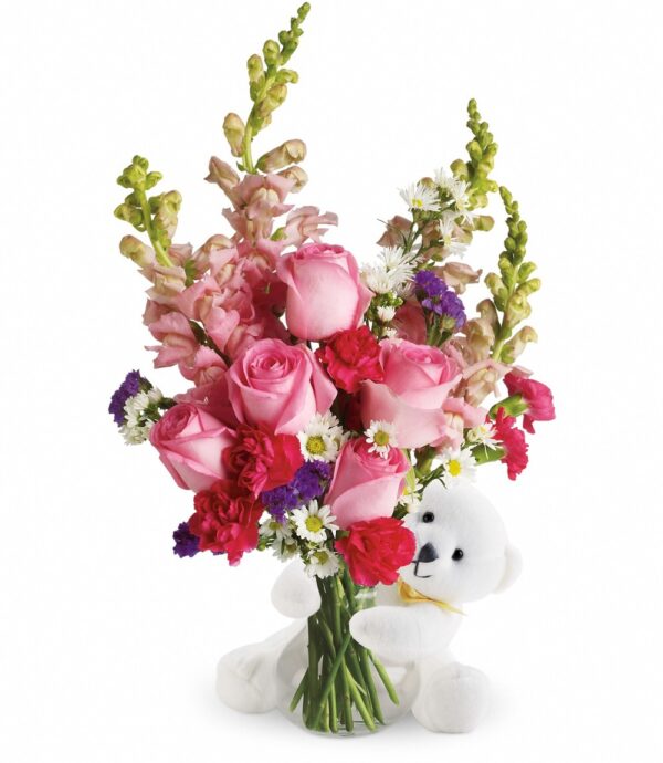 When words aren’t enough, say it with a Bear Hug. This sweet and sentimental arrangement features a charming mix of pink roses, vibrant red carnations, lavender statice, and cheerful daisies—cradled lovingly by an adorable plush white teddy bear. Perfect for birthdays, get-well wishes, new babies, or simply to show how much you care, Bear Hug wraps your sentiments in color, softness, and affection. It’s not just a bouquet—it’s a warm embrace.