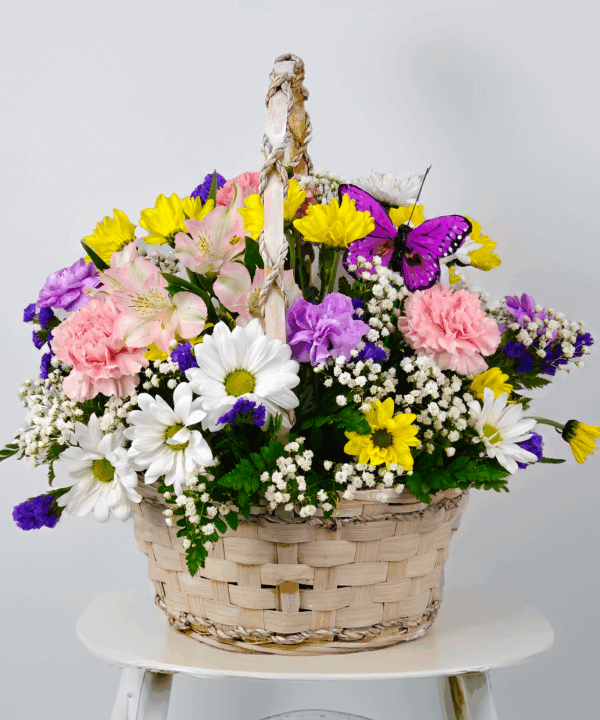 Overflowing with charm and color, the Beautiful Garden Basket is a joyful celebration of nature’s most cheerful blooms. This delightful design features an artful blend of pink carnations, soft purple lisianthus, crisp white daisies, sunny yellow mums, and delicate accents of filler flowers. Presented in a charming white wicker basket, the arrangement is topped with a graceful butterfly for a whimsical finishing touch.