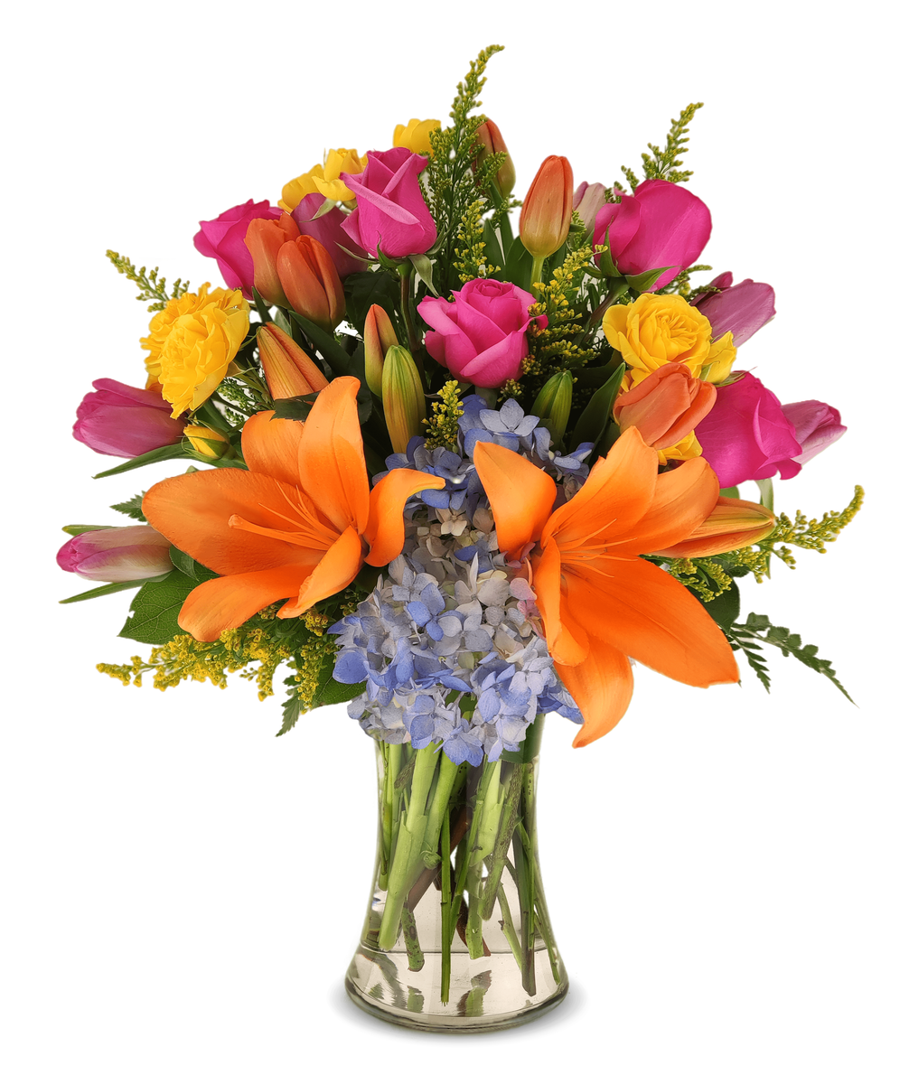 Burst of Color is a striking floral arrangement designed to light up any room with its brilliant palette. This cheerful bouquet features vivid orange Asiatic lilies at the heart, accented by rich pink and purple tulips, elegant hot pink roses, sunny yellow spray roses, and golden yellow carnations. A soft bed of sky-blue hydrangeas anchors the piece, while sprigs of lush greenery add volume and freshness. Presented in a sleek clear glass vase, this design is perfect for birthdays, celebrations, thank-you gifts, or simply to brighten someone’s day.