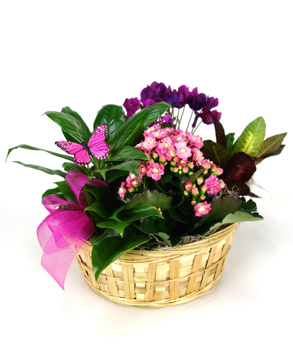 Celebrate the colors of the season with Butterfly Gardens—a vibrant basket brimming with fresh blooming plants and lush green foliage. Thoughtfully designed with a mix of textures and hues, this arrangement is accented by a playful butterfly pick and finished with a coordinating bow for added charm.