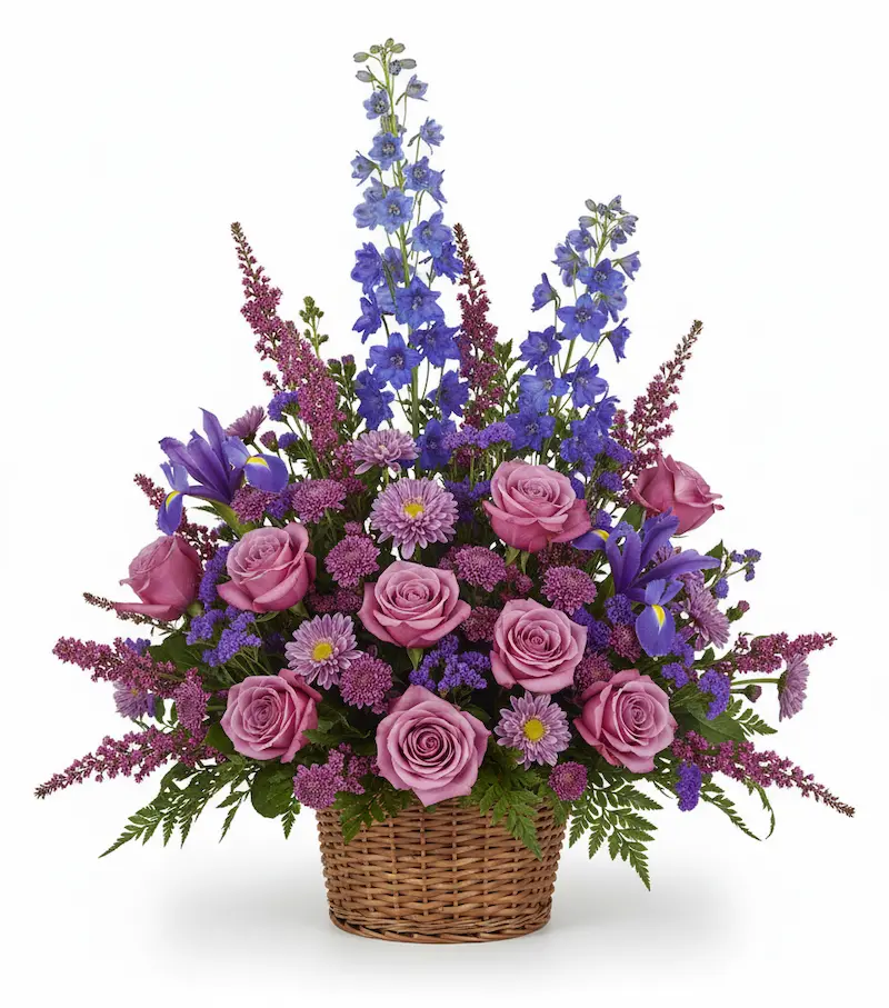 Let your sympathy speak softly and beautifully with the Gentle Comfort Basket. This radiant blend of lavender roses, blue delphinium, iris, and heather evokes a sense of peace, care, and gentle remembrance.
