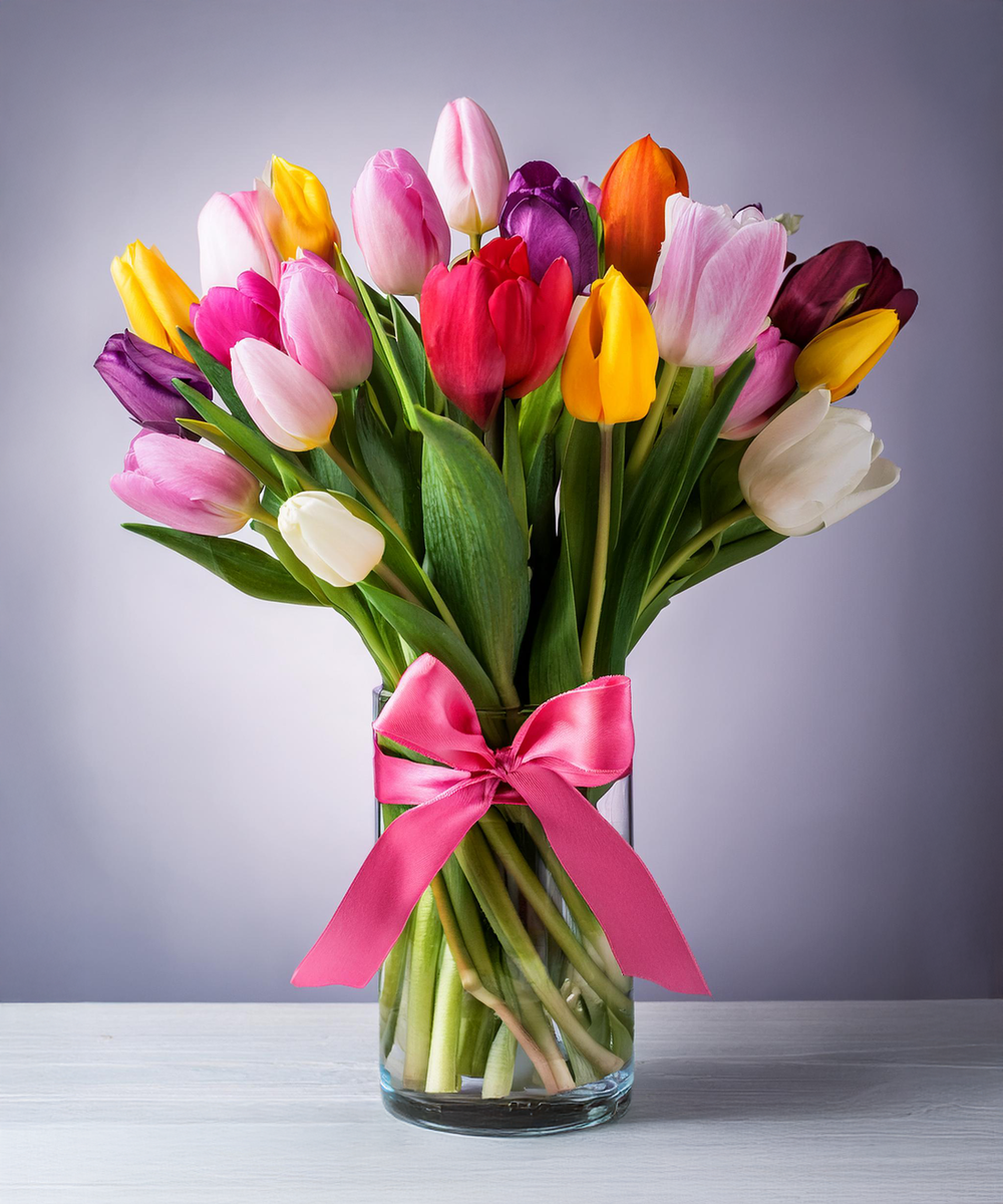A vibrant mix of multi-colored tulips in a tall glass vase tied with a pink ribbon. Cheerful, elegant, and perfect for any occasion.