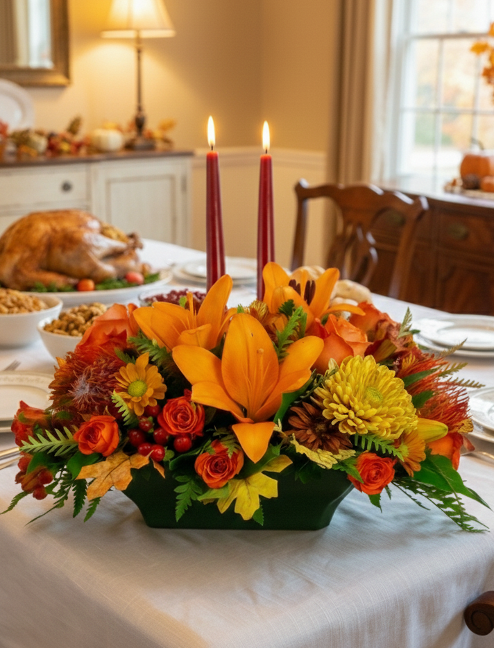A festive Thanksgiving centerpiece crafted with rich autumn color and glowing candlelight to bring warmth and elegance to your holiday table. Its lush, textural design adds depth and seasonal charm to any celebration. Premium version showcases the fullest, most luxurious display.
