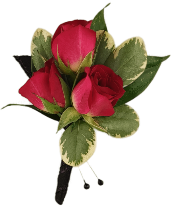 A refined boutonniere featuring three roses accented with lush greenery and natural textures. Designed for weddings, proms, or special events, this piece offers a polished, timeless look that complements a variety of styles and color palettes.