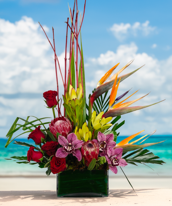 Capture the warmth and wonder of the tropics with Tropical Bliss—a radiant arrangement bursting with color and personality. This exotic design blends the striking beauty of Birds of Paradise, dramatic protea, elegant orchids, and timeless red roses, all accented with tropical foliage and modern accents.