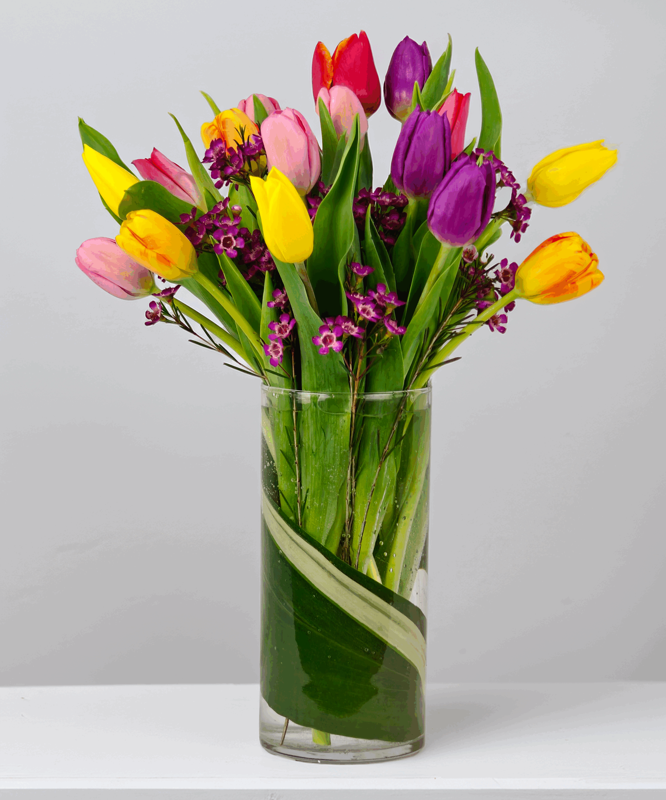 Soft and elegant, Tulips Galore features pastel tulips in shades of pink, yellow, and lavender, accented with delicate purple waxflower. A simple leaf wrap in the clear glass vase adds a modern touch. This arrangement is a beautiful way to celebrate the season or send a thoughtful hello.